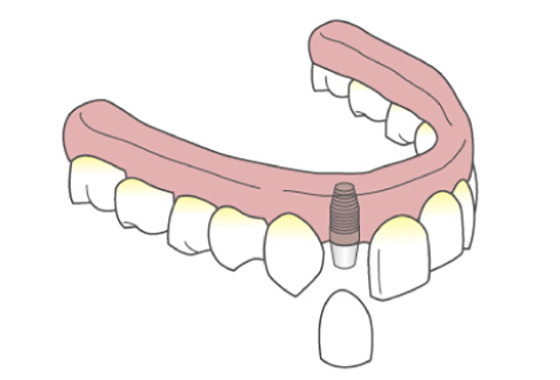 「1本義歯」とは、隣在歯に金具を回し、脱着可能な部分入れ歯を装着する方法です。隣在歯を削らずに済みますが、歯ぐきと入れ歯の間に食物が入り込むと痛みを伴うなど装着感に満足できない場合があります。費用が抑えられ、短期間で治療できることがメリットですが、咬合力、審美性は他の方法に劣ります。